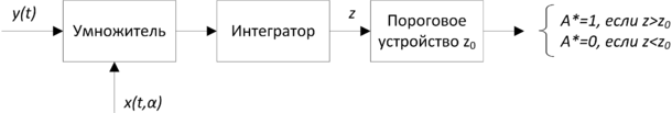 На умножитель подается опорное колебание x(t,α), соответствующее ожидаемому сигналу, и принятый сигнал y(t).