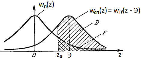 За счет этого сдвига при достаточной энергии сигнала можно получить требуемую условную вероятность правильного обнаружения D для допустимого значения условной вероятности ложной тревоги F, определяемой установленным уровнем порога z0.