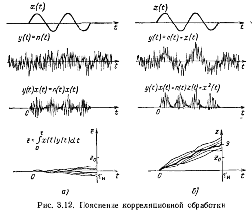 Физический смысл корреляционной обработки поясняется на рисунке 3, а и б, где показаны ожидаемые колебания x(t) = x(t, α), принимаемые колебания y(t) = n(t) при отсутствии сигнала и y(t) = п(t) + x(t) – при его наличии, а также проиллюстрирован результат перемножения функций x(t), y(t) и интегрирование за время существования опорного сигнала [для разных реализаций y(t)].