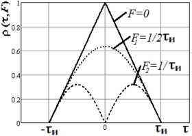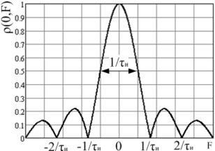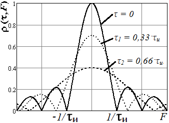 Если входной сигнал рассогласован по частоте на F0, то нормированная огибающая напряжения на выходе фильтра определяется сечением тела неопределенности ρ(τ, F) плоскостью F = F0.