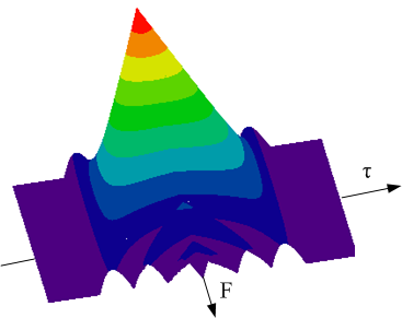 На рисунке 6 а показано сечение показано сечение нормированной функции неопределенности (по напряжению) плоскостью F = 0, а на рисунке 6 б показано сечение плоскостью τ = 0.