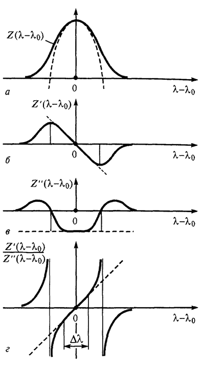 При большом отношении сигнал—шум зависимость модульного значения функции правдоподобия от параметра рассогласования можно аппроксимировать квадратичной функцией (рис. 5а), первой производной — линейной функцией (рис. 5б), а второй производной — постоянным значением (рис. 5в).