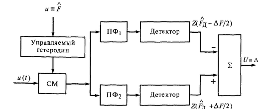 Преобразованное (демодулированное) колебание поступает на два канала обработки, в которых полосовые фильтры ПФ1 и ПФ2 расстроены по частоте.