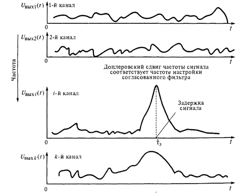 Каждый канал настроен на определенную частоту, обеспечивает согласованную обработку сигнала с фиксированным доплеровским сдвигом и включает согласованный фильтр и детектор огибающей. На выходе каждого канала (см. рис. 12, б) формируется функция правдоподобия по задержке для фиксированной частоты.