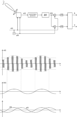 Таким образом, в приближении малых углов сигнал на выходе детектора является гармоническим, амплитуда и фаза которого определяют угловое положение цели. Для выделения информации об амплитуде и фазе этого сигнала в схеме обработки РЛС используются опорные сигналы