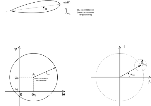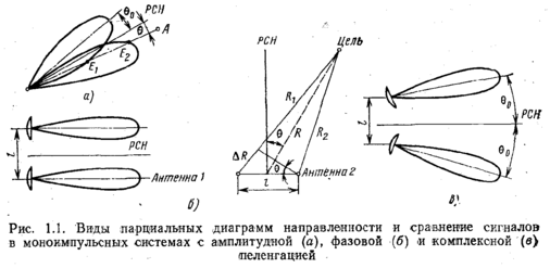 от равносигнального направления (PCH) (цель находится в точке А) сигнал, принятый по нижней диаграмме, больше сигнала, принятого по верхней диаграмме. Разность амплитуд принятых сигналов определяет угол отклонения цели от равносигнального направления. Знак этой разности характеризует направление смещения равносигнального направления относительно цели. Когда равносигнальное направление совмещается с целью, амплитуды отраженных сигналов, принятых по обеим диаграммам, равны, а их разность обращается в нуль.