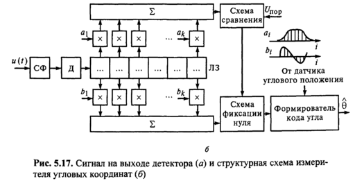 С выхода приемника на вход измерителя поступают импульсы, прошедшие согласованную обработку, которые запоминаются в регистре (линии задержки (ЛЗ)) на временном интервале, равном длительности пачки. Оценка производной обеспечивается суммированием отсчетов, снимаемых с выходов регистра, со специально подобранными весовыми коэффициентами пропорциональными производной огибающей. Момент времени, для которого производная огибающей равна нулю, определяется схемой фиксации. Чтобы исключить отсчет угловой координаты по шумовой выборке, угловая информация считывается только при наличии полезного сигнала. Решение о его наличии принимается в обнаружителе, где осуществляется накопление отсчетов с весовыми коэффициентами, пропорциональными огибающей пачки, и сравнение накопленного сигнала с пороговым значением.