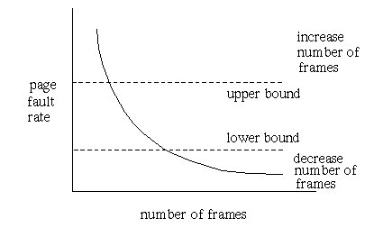 Второй способ более практический. Как было показано выше, размер выделяемых процессу кадров влияет на частоту страничных исключений. Будет отслеживать статистику page fault’ов, происходящих в этом процессе. Если оно велико, значит, рабочее множество не умещается в выделяемом наборе кадров физической памяти, и его необходимо расширить. В противном случае, можно забрать часть кадров у данного процесса в пользу других процессов.