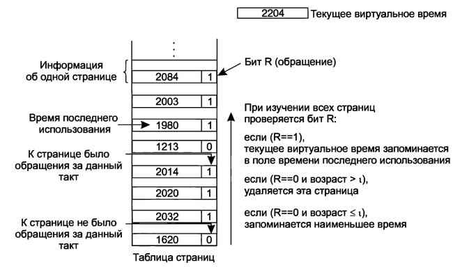 Стоит пояснить некоторые моменты. Каждая запись в таблице страниц дополняется двумя полями: битом обращения и временем последнего доступа. Периодически происходит прерывание от таймера, которое сбрасывает бит обращения R. При необходимости выгрузки странице нужно просканировать таблицы и определить записи со сброшенным битом и временем последнего использования, не попадающим в окно рабочего множества. Так выбираются кандидаты на выгрузку.