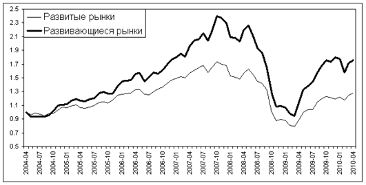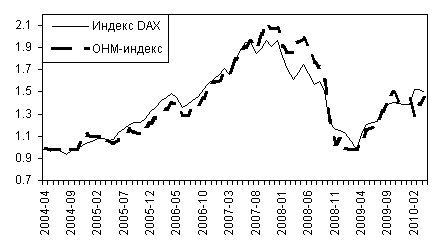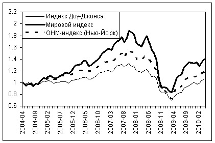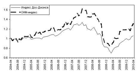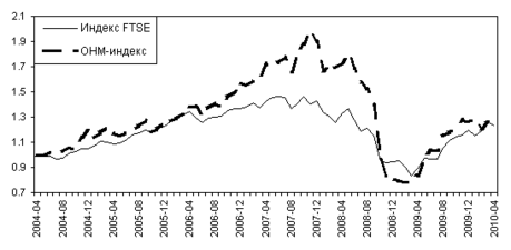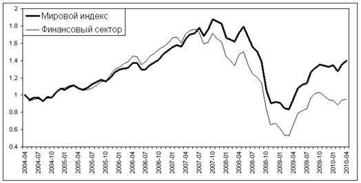 Также ОНМ позволяет строить индексы и для отдельных секторов экономики. Интерес представляет сравнение индекса финансового сектора с мировым.