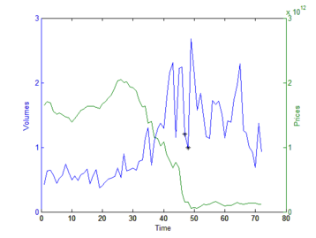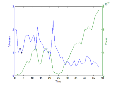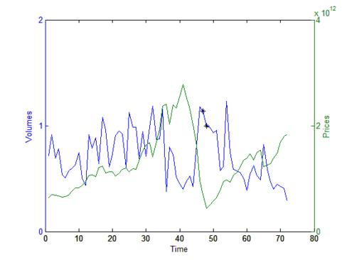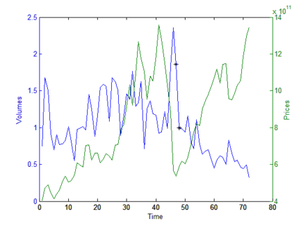 Рисунок 37 иллюстрирует поведение котировок Apple. Март-апрель [30] наблюдаются относительно невысокими объёмами продаж, но растущей ценой. Прошло какое-то время после релиза iPhone и инвесторы отличались в своих оценках данного творения Apple. Тем не менее какая-то их часть действуя в то время нерационально поставила на данный продукт и вкладывалась в акции Apple. Это момент нерациональности был отмечен алгоритмом.