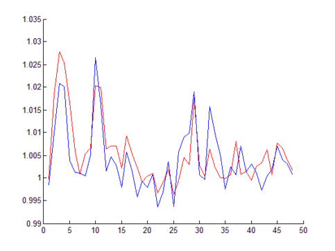 , а красной – полученный для торговой статистики, состоящей из 5 товаров. Видно, что общие тенденции графиков совпадают, но отдельные пики могут быть выражены по-разному.