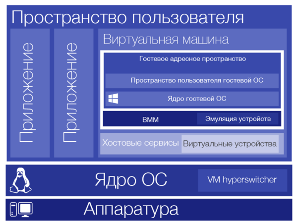 Рис 2. Архитектура виртуальной машины, опирающейся на средства аппаратной виртуализации