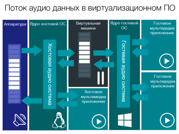 - Гостевая ОС отдает аудио данные не напрямую в оборудование, а в буфер виртуальной машины (эмулированный DMA буфер), из которой их забирает для воспроизведения хостовая ОС (либо же гостевая ОС получает буферизированные данные, которые должны быть еще сгенерированы на хосте для случая записи звука). Это означает, что нежелательная составляющая задержки аудио потока складывается как минимум из задержки хостовой и гостевой ОС.