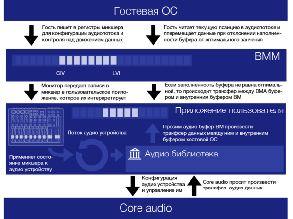 - Между DMA регионом виртуальной машины и хостовой аудио системой устанавливается дополнительный single-consumer-single- producer буфер, через который осуществляется передача данных. В таком случае виртуальная машина и хостовая аудио подсистема работают в асинхронном режиме. Такой подход использован в Virtual Box и текущей версии Parallels Desktop.