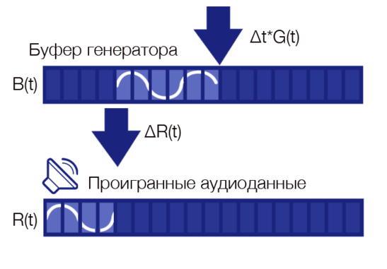 - В случае, если количество данных в буфере снижается в сравнении с оптимальным, то ОС с некоторой вероятностью (обусловленной различным поведением системы на разных уровнях загрузки) переходит в режим форсированной генерации аудиоданных для восполнения буфера.