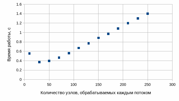 Учитывая этот факт, становится понятно, что количество узлов, обрабатываемых процессором, не может быть равно одному. Поэтому было проведение исследование, для выяснения того, какое лучшее число узлов.