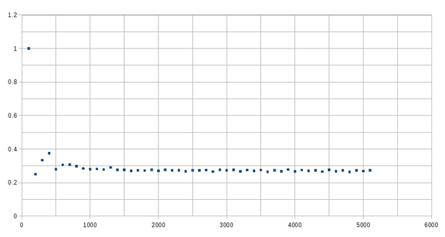 Попробуем выяснить, насколько оптимален алгоритм, для этого, как и в случае последовательного алгоритма построим зависимость времени, приходящегося на расчет одного узла сетки, от размера сетки.