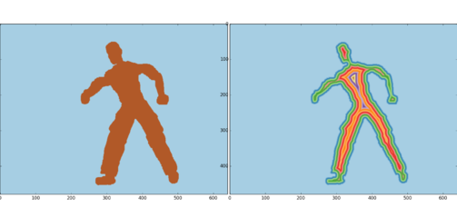 Как известно, скелетом фигуры называется множество центров всех её максимальных пустых кругов. В [1] рассматривается ещё одно определение скелета, основанное на понятии дистанционной функции формы. Дистанционная функция для каждой внутренней точки формы задает «глубину» ее расположения относительно границы, равную расстоянию от этой точки до границы фигуры. Дистанционная функция строится последовательным обходом всех внутренних точек формы, начиная со «слоя» точек максимально близких к границе. Пройдя один слой полностью, мы переходим на следующий слой внутрь формы. Визуализация результата представлена на рисунке ниже: