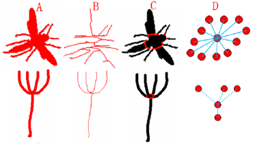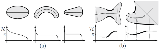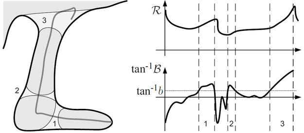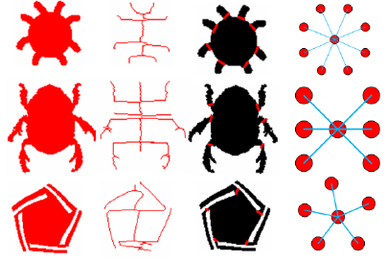 Анализ проходит на основании скелета сглаженной локальной симметрии (Smoothed Local Symmetries - SLS). Представим головку машины, которая последовательно скользит по осям такого скелета. Таким образом, форма – это объединение ребер, соединяющих симметричные точки границы формы, с центром на оси.