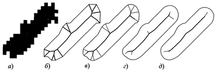 Рис.10. Исходное растровое изображение (а), минимальный разделяющий многоугольник и его скелет (б), последовательная стрижка ребер (в)-(д).