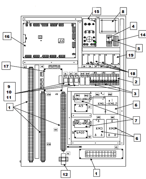7. пускатели привода дверей КМ4, КМ5 (проходная кабина) (для регулируемого привода дверей пускатели КМ4 и КМ5 могут не применяться);
