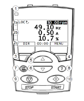 2a. Область дисплея, отображающая режим управления: местное (LOC) и удаленное (REM) управление. Также справа отображается скорость задания.