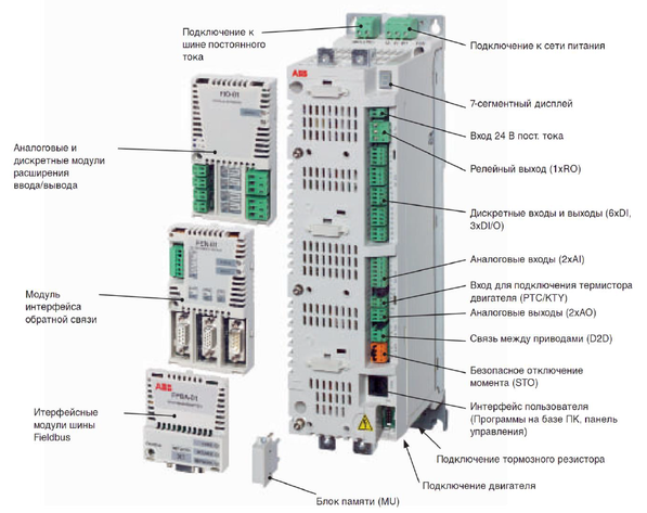 3. Интерфейсные модули шины fieldbus, предназначены для подключения связи по каналу PROFIBUS, CANopen, DeviceNet или Ethernet/IP, для удаленного управления приводом.