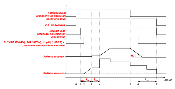 На рисунке 1.11 приведены временные диаграммы, иллюстрирующие работу привода и станций управления УЭЛ, ШУЛМ, ШК6000 и ШЛ-Р Р. Для асинхронного двигателя (АД) необходимо выбрать в параметре 84.01РЕЖИМ ПУСКА значение «Заданное время».