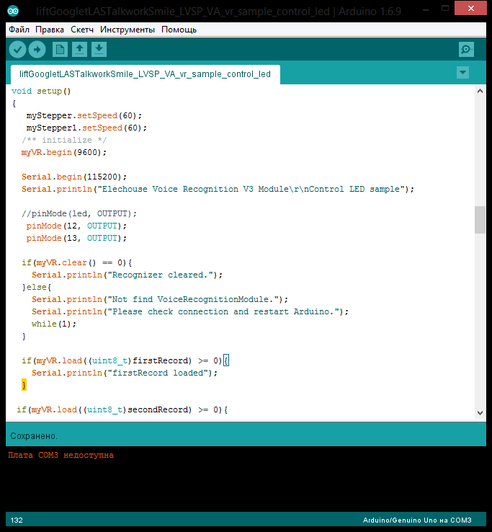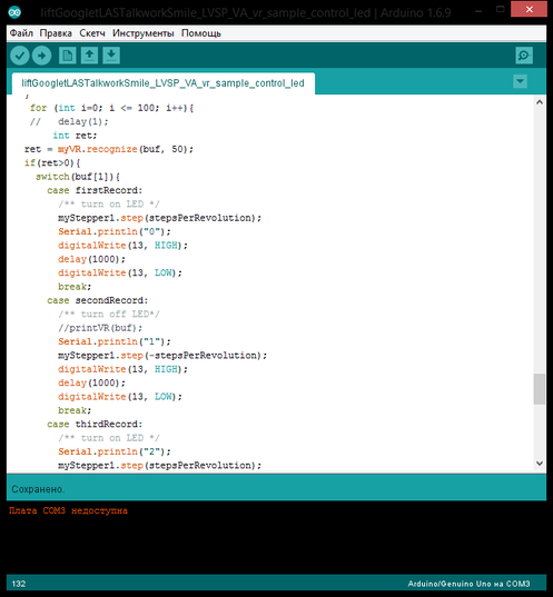 Далее в программе однократно запускается функция настройки void setup и выполняется проверка текущего состояния модуля распознавания голоса. Микропроцессор через уже настроенный последовательный порт c использованием команды Serial.println отправляет тестовый запрос для получения в ответ диагностической информации. Если при взаимодействии устройств по протоколу RS-232 появились проблемы и подключение не было установлено, то программа сформирует соответствующее сообщение и отправит его в COM-порт (просмотреть сообщение можно открыв монитор порта). Эти действия выполняются командами Serial.println("NotfindVoiceRecognitionModule.") и Serial.println("PleasecheckconnectionandrestartArduino.") – модуль распознавания голоса не найден или не обнаружен и пожалуйста проверьте соединение и перезапустите микроконтроллер. Если подключение с голосовым модулем было выполнено успешно, то программа выполнит загрузку голосовых команд и отправит соответствующее сообщение в последовательный порт с помощью команд (myVR.load((uint8_t)firstRecord) >= 0){ Serial.println("firstRecordloaded");}. Данная операция повторяется для всех семи сигнатур.