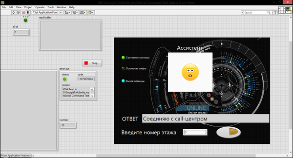 Графический интерфейс содержит визуальный образ ассистента, который может быть задан любым анимированным изображением, используемые файлы анимации должны иметь стандартное расширение gif. Также на лицевой панели отображаются индикаторы «Состояние системы», «Остановка лифта по требованию» и «Вызов помощи». При вводе голосовых команд и сообщении номера этажа ассистенту на экране отображается ответ ассистента. Ответ показывает какую команду ассистент распознал и будет выполнять. Для задания номера этажа вручную без использования голосового интерфейса можно воспользоваться текстовым полем для ввода команды. Когда ассистент получит команду от пользователя, кроме индикации ответа на экране, также системой будет воспроизведено звуковое сообщение, при этом меняется визуальный эффект анимации ассистента (например, на «произношение»). Звуковые сообщения воспроизводятся программой из раннее записанных файлов. Запись аудио файлов выполняется с помощью технологии машинного чтения текста. Для этого использовался сервис translate.google.ru. Текст ответа записывался на странице переводчика в браузере и с помощью инструмента «прослушать» воспроизводился на компьютере (динамиками). Средствами LabVIEW производилась запись звуковых сообщений и составлялась база аудиофайлов с ответами.