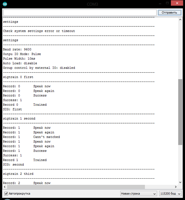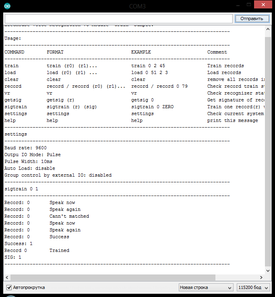 В настройках нужно установить значение скорости обмена данными (baudrate) 115200 и отправку по новой строке, как показано на рисунке 4.3. Далее требуется ввести в верхнее поле команду settings и нажать кнопку "Послать". Таким образом, модуль в ответ отправит сообщение со своими текущими настройками. Если не появилось сообщения о том, что модуль не найден и в текстовом поле монитора были определены параметры текущей конфигурации это значит, что соединение с устройством по COM-порту установлено и теперь можно приступать непосредственно к обучению модуля голосовым командам. Обучение командам производится при помощи функция sigtrain. Функция вводится в текстовое поле монитора последовательного порта, если ввести и отправить команду sigtrain 0 first и нажать на кнопку "Послать", то будет активирован режим записи команды с сигнатурой «first» в ячейку памяти модуля 0. Сигнатура это уникальный ярлык (имя), который описывает команду, т. е. first означает первый этаж для нашей системы. Когда в окне монитора появится сообщение "Speaknow", то следует проговорить в микрофон голосовую команду "Первый". После появления сообщения "Speakagain", требуется проговорить команду еще раз. Если оба слова совпали, то модуль выдает сообщение Success: 1, это означает, что команда успешно распознана и записана. Если модуль не смог сопоставить две команды (например, было шумно в помещении или команды были разными), то модуль выдаст сообщение о неудачной попытке записи "Cann'tmatch", после чего предложит начать процесс записи команды заново до тех пор, пока не будут предоставлены верные данные. В процессе записи команд время для произношения сигнализируется красным светодиодом, а время распознавания голосовой команда сигнализируется миганием желтого светодиода на плате модуля. В результате успешного обучения и записи сигнатур в памяти устройства появится сообщение Record 0 Trained (рисунок 4.3). Этот процесс выполняется и для других команд (Второй этаж, Третий этаж и т. д.), но при этом используются другие ячейки памяти (1 и 2), например нужно ввести в командную строку монитора COM-порта функцию sigtrain 1 second и повторить процедуру записи для других сигнатур.
