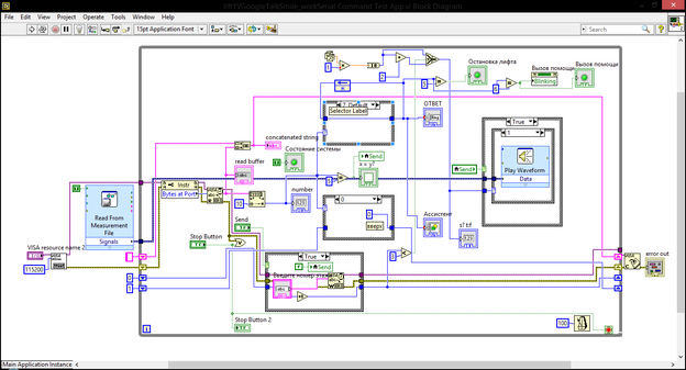 Приложение разработанное в LabVIEW работает следующим образом: сначала выполняется конфигурация параметров последовательного порта посредством функции VISASerial и загрузка аудиофайлов с помощью подприбора ReadFromMeasurementFile, после чего устанавливается соединение по протоколу RS-232 с микропроцессорной платформой Ардуино через USB. Далее запускается цикл whileloop (по условию), в котором производится чтение/запись команд из/в COM-порт с помощью функций VISARead/Write. Воспроизведение звукового сообщения выполняется посредством Express-VIPlayWaveform. Определение поведения ассистента выполняется с помощью структур case для каждой команды. Блок диаграмма программы представлена на рисунке 4.9.