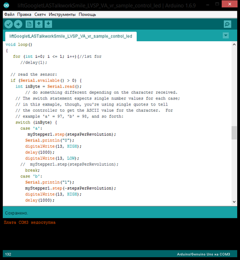 После выполнения настроек всех параметров системы запускается бесконечный цикл (рабочая часть программы). Цикл voidloop содержит два цикла for. В первом цикле реализуется следующая программная конструкция: если микропроцессор получает команду по последовательному порту (от панели управления/планшетного компьютера), то выполняется одна из структур case. Эта структура позволяет управлять процессом выполнения программы, программист может задавать альтернативный код, выполняемый при разных условиях. Если найден оператор case, значение которого равно значению переменной полученной через последовательный порт, то выполняется программный код в этом операторе. Для лучшей структуризации и разделения имен переменных разных циклов операторам case присвоены латинские символы соответствующие номеру этажа заданного пользователем (например, case ‘а’ выполняется, когда пользователь выбрал первый этаж). При этом латинский символ ‘а’ является внутренней программной переменной, которая определяется программой как команда 0 с сигнатурой first. Ключевое слово break является командой выхода из оператора case. После выполнения запроса пользователя процесс повторяется заново.