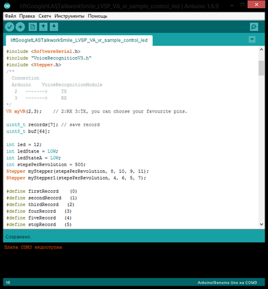 После того как модуль распознавания устной речи был обучен голосовым командам его можно использовать в системе управления совместно микропроцессорной платформой Ардуино. Для этого требуется загрузить в память микроконтроллера новый скетч, выполняющий непосредственно обработку голосовых команд пользователя. Программа состоит из нескольких основных частей, однократно запускаемых функций настройки микроконтроллера и циклически выполняемого кода. На рисунке 4.4 представлен фрагмент кода, выполняющий подключение дополнительных пользовательских библиотек c помощью функции #include, настройку цифровых выводов микроконтроллера 2 и 3 на работу в режиме передачи информации по протоколу RS-232 посредством команды VR myVR(2,3), а также первичную конфигурацию некоторых программных констант и переменных.