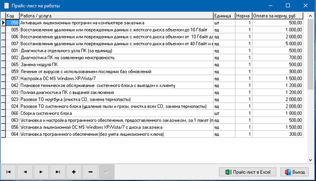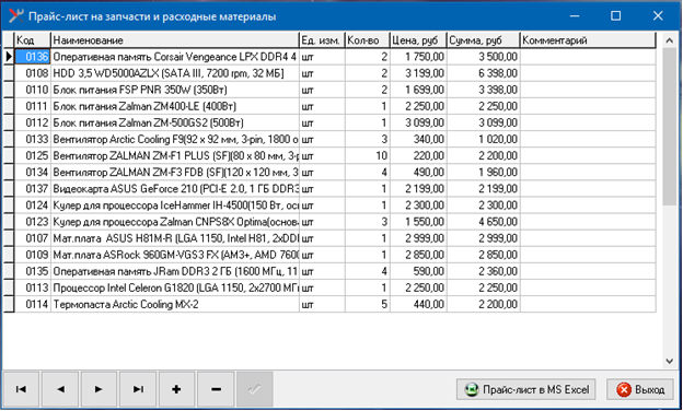 Модуль Stores.pas – модуль для ведения Прайс-листа на запчасти и расходные материалы, позволяет создавать, редактировать и удалять данные о запчастях сервисного центра. Особенностью реализации является возможность автоматической сортировки данных при щелчке мышью по выбранному столбцу данных на экранной форме. Также к модулю подключен модуль Reports.pas, позволяющий пользователю при необходимости сформировать отчет в формате MS Excel по данным представленным на экранной форме и распечатать его. Экранная форма модуля Price.pas представленна на рисунке 3.14.