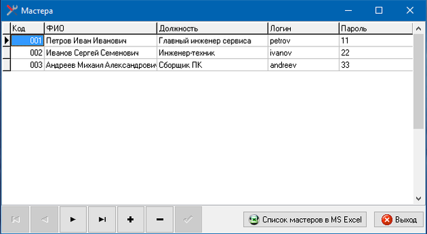 одуль Staffs.pas – модуль для ведения справочника «Мастера», позволяет создавать, редактировать и удалять данные о мастерах сервисного центра. Особенностью реализации является возможность автоматической сортировки данных при щелчке мышью по выбранному столбцу данных на экранной форме. Также к модулю подключен модуль Reports.pas, позволяющий пользователю при необходимости сформировать отчет в формате MS Excel по данным представленным на экранной форме и распечатать его. Экранная форма модуля Staffs.pas представленна на рисунке 3.10.