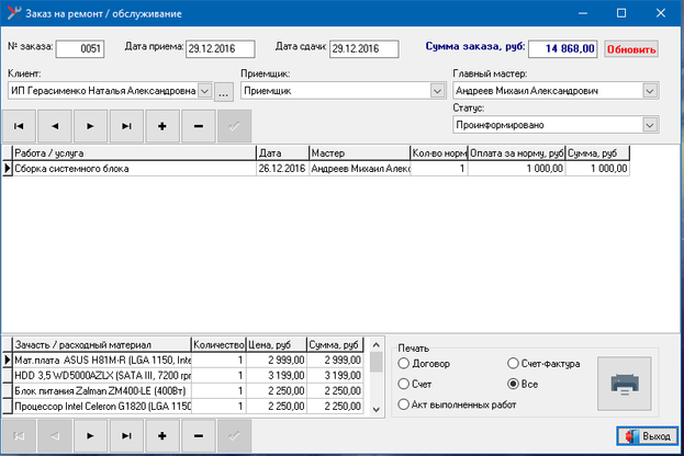 Модуль Order.pas – модуль заказа, позволяет создавать, редактировать и удалять данные о заказе сервисного центра. Особенностью реализации является автоматический расчет суммы по заказу с учетом работ и материалов.