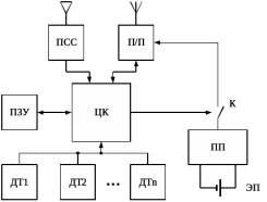 Термоизмерительная скважина (рисунок 21) будет состоять из центрального контроллера (ЦК) к которому через общую шину подключены датчики температуры (ДТ1 - ДTn), приёмник сигнала сигнализации (ПСС), основной приёмно-передающий модуль (П/П) и постоянное запоминающее устройство (ПЗУ) для хранения результатов измерений. Для уменьшения энергопотребления основной приемо-передающий модуль в режиме ожидания будет отключаться центральным контроллером от преобразователя питания (ПП) с помощью реле (К) и включаться только после появления в области видимости мобильного приемника. Для обнаружения мобильного приемника в состав оборудования скважины включен дополнительный канал сигнализации, реализованный с помощью маломощного преемника сигнала синхронизации. Питание всего устройства предполагается через преобразователь питания от встроенного элемента питания (ЭП).