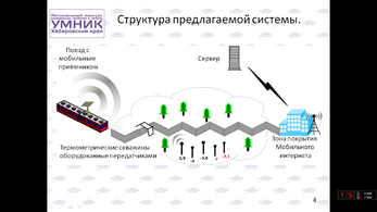 Первый уровень системы представлен устройствами измерения температуры (термометрические скважины), состоящих из набора датчиков температуры расположенных на разной глубине, приёмо-передающего модуля, управляющего контроллера и элемента питания. Термометрические скважины располагаются вдоль железных или автомобильных дорог и передают данные на приёмные устройства расположенные на поездах или автомобилях. Приемные устройства составляют второй уровень системы и пересылают данные на сервер при попадании в зону действия общественных беспроводных сетей (GSM/GPRS, Wi-Fi и т.д.) [4]. Третий уровень системы представлен в виде сервера выполняющего обработку и систематизацию данных (рисунок 21).