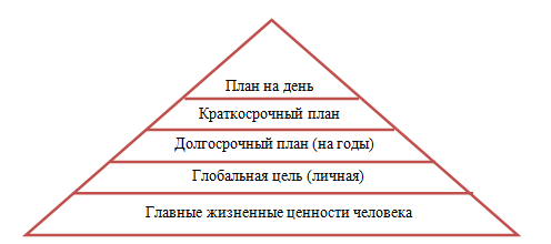 Метод Франклина. Система управления рабочим временем по методу Франклина «направлена вперёд» – она работает с тем, что должно быть сделано. Глобальная задача дробится на подзадачи, те – на ещё более мелкие подзадачи 29, с. 68. Более наглядно систему можно отобразить в виде ступенчатой пирамиды, представленной на рисунке 3, а процесс её применения – как процесс строительства этой пирамиды.