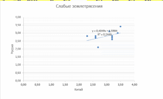 На рисунке 3.5 линия корреляции показывает положительную связь магнитуд землетрясений России и Китая, об этом еще говорит