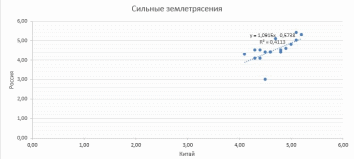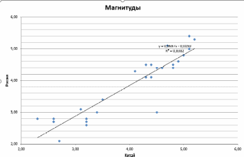 Рисунок 3.5-связь магнитуд землетрясений России и Китая
