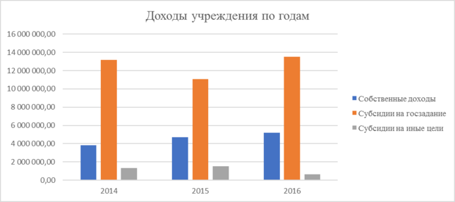 Доходы учреждения за 2014-16гг. по источникам финансирования представим графически (рисунок 2):