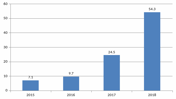 1. Организация вещания телеканалов в формате HDTV. В мире имеет место тенденция развития вещания HDTV – контента по сетям наземного эфирного вещания. В ряде зарубежных стран переход на стандарт вещания DVB-T2 сопряжен с началом вещания контента в формате HDTV. Протоколом заседания Правительственной комиссии по развитию телерадиовещания от 25 февраля 2016 года признано целесообразно внедрение стандарта телевидения высокой четкости для дальнейшего развития наземного эфирного телевизионного вещания на территории РФ. Соответственно внедрение эталонного эфирного телевизионного вещания в формате HDTV, дает ФГУП «РТРС» новые возможности. «РТРС» может рассчитывать на увеличение коммерческих доходов от оказания данной услуги. В период до 2018 года прогнозируется существенное увеличение количества абонентов, просматривающих каналы в формате телевидения высокой четкости, эти результаты расположены на рисунке 3.1, представленном ниже.
