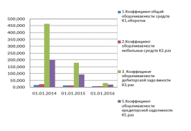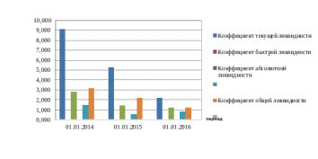 Коэффициент общей ликвидности показывает способность компании погашать текущие (краткосрочные) обязательства за счёт только оборотных активов. По сравнению с анализируемым периодом на 2014 г. данный показатель сократился на 46,4 %. Рекомендуемая норма для данного показателя >1. Для нашего предприятия данный показатель не попадает в пределы рекомендуемого значения, это свидетельствует о том что, предприятие в состоянии стабильно оплачивать текущие счета.