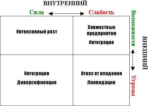 Сильные и слабые стороны внутренней среды организации в такой же мере, как и угрозы и возможности, определяют условия успешного существования организации. Поэтому стратегическое управление при анализе внутренней среды выявляет именно то, какие сильные и слабые стороны имеют отдельные составляющие организации и организация в целом (рисунок 1).