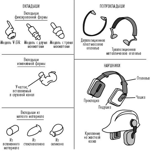 К наиболее простым средствам защиты относят вкладыши, которыми закрывается слуховой проход уха. Это мягкие тампоны из обычной ваты, ультратонкого волокна смоченного парафином, а также жесткие заглушки (втулки) в форме конуса из резины, пластмассы и др. Однако вкладыши недостаточно эффективны (5-20дБ), поэтому широко применяются противошумные наушники и шлемы, закрывающие ушную раковину снаружи. Данные противошумы защищают рабочего от производственного шума (эффективностью 20-40дБ) и позволяют слышать разговорную речь. Виды СИЗ приведены на рисунке 4.3.