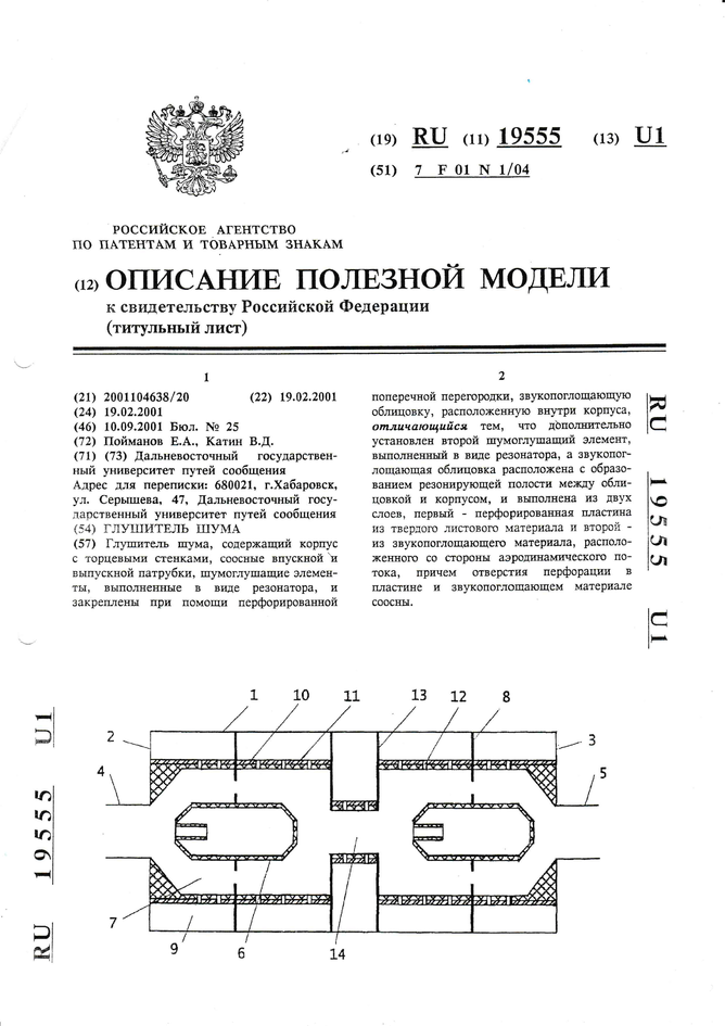 Пат. 19555 Российская Федерация, F01 №1/04. Глушитель шум [Текст] / Катин В.Д., Пойманов Е.А.; опубл. 10.09.01. Бюл. №25.