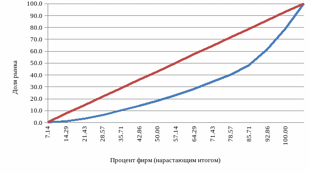 Индекс Джини удобно проиллюстрировать с помощью кривой Лоренца. Кривая Лоренца, отражающая неравномерность распределения какого-либо признака, для случая концентрации продавцов на рынке показывает взаимосвязь между процентом фирм на рынке и долей рынка, подсчитанной нарастающим итогом, от мельчайших до крупнейших фирм.